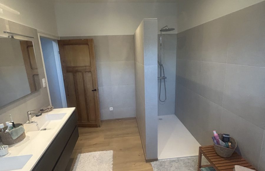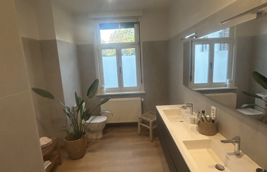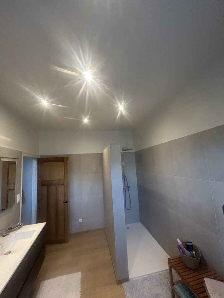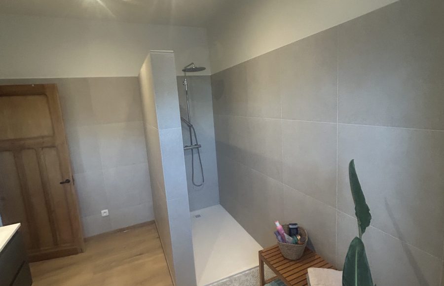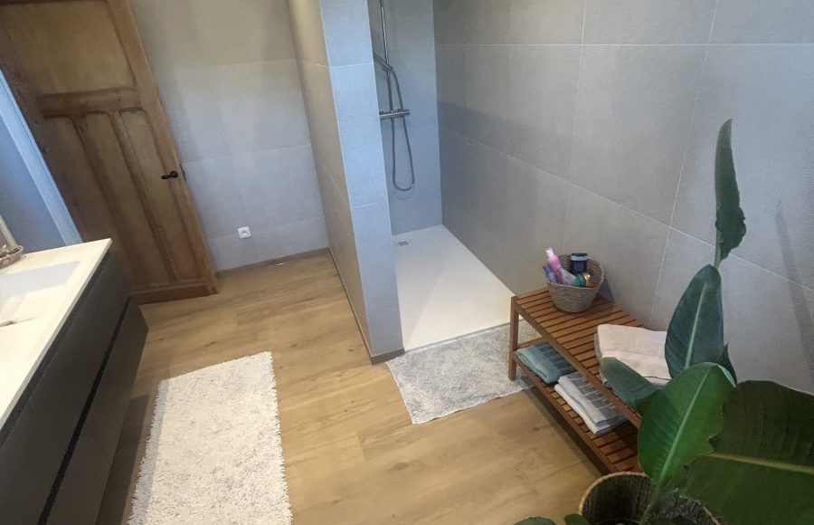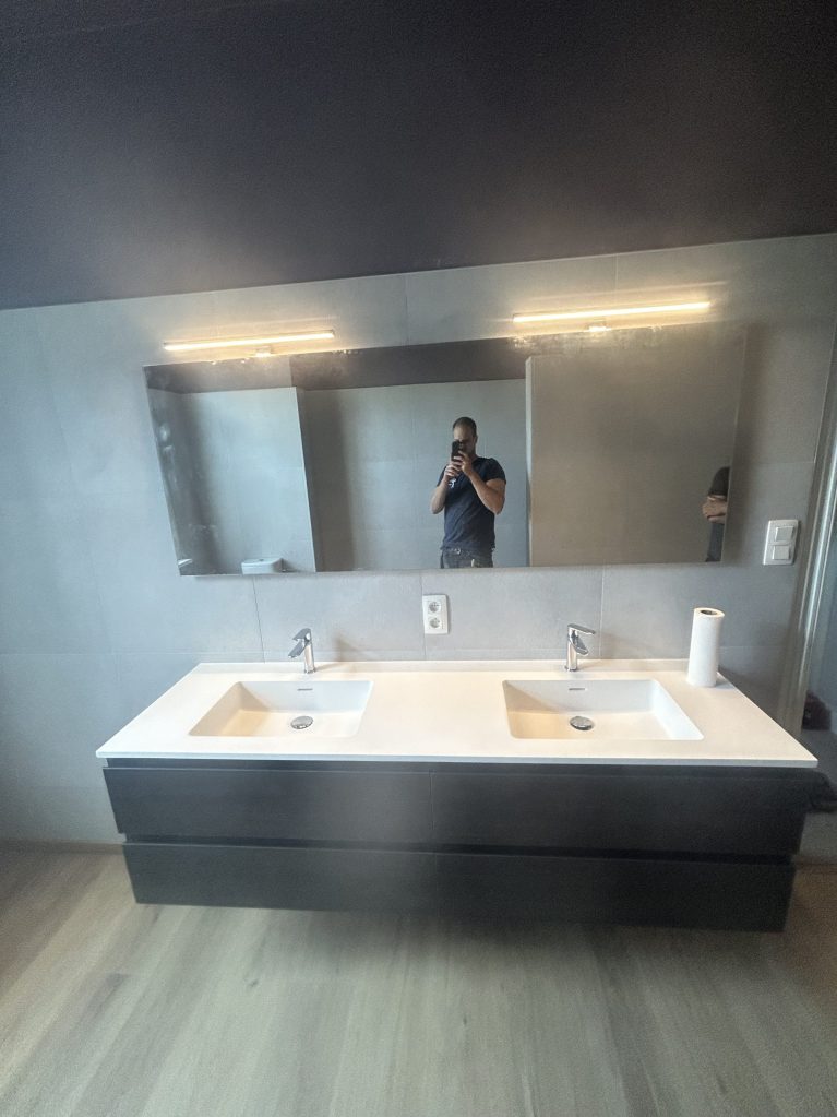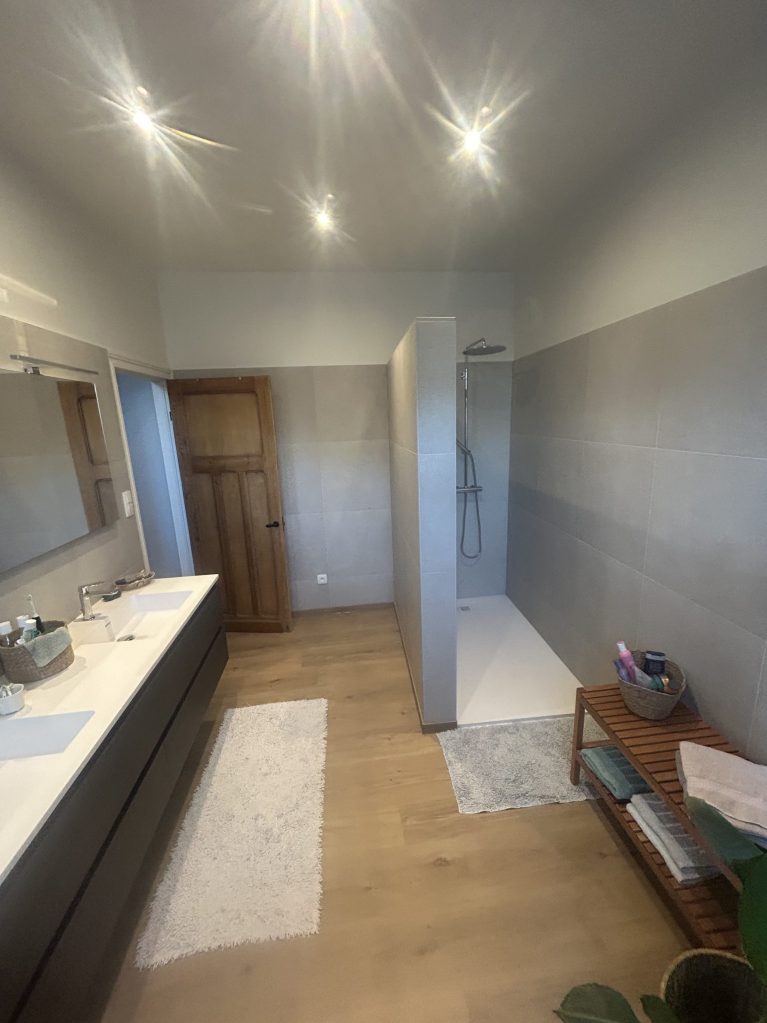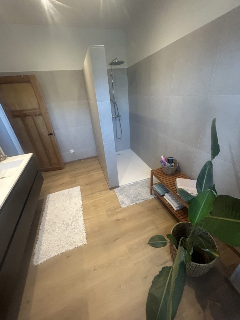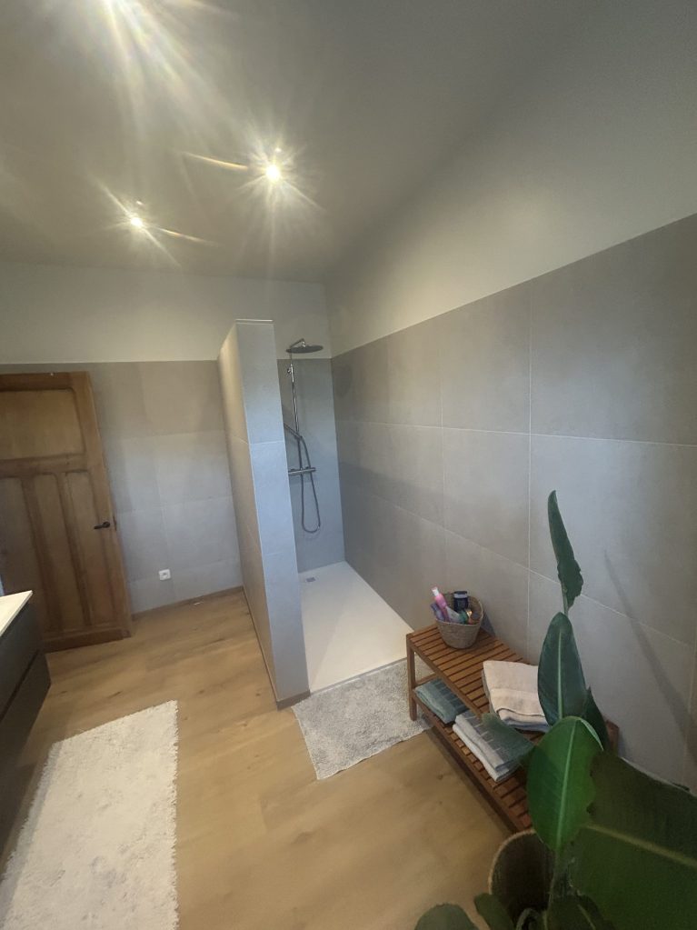Een project te Kaprijke. Woning is houtskelet en er werd geopteerd voor een vinyl-vloer. De Douche werd uitgevoerd met een vaste wand bestaande uit tegels.